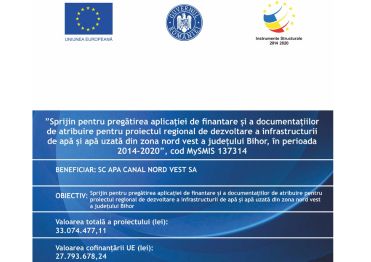 Sprijin pentru pregătirea aplicatiei de finanţare şi a documentaţiilor de atribuire pentru proiectul regional de dezvoltare a infrastructurii de apă și apă uzată din zona de nord vest a judeţului Bihor, în perioada 2014-2020 Cod SMIS 2014:137314