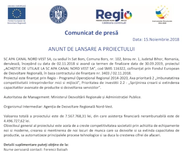 Az Észak-Nyugati Víz- és Csatornaművek (SC APA CANAL NORD VEST SA) részvénytársaság, melynek székhelye Borș Község, Borș Falu, 102. házszám, 1 számú iroda, Bihar megye, Románia, 2018.11.02-től 2019. 09. 30-ig „Berendezések Beszerzése Az Észak-Nyugati Víz- És Csatornaművek Részvénytársaságnál” címmel, 116322 SMIS kóddal, pályázatot nyert az Európai Regionális Fejlesztési Alap társfinanszírozásával, a 3403/2018.11.02. számú finanszírozási szerződés alapján.